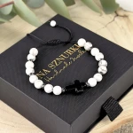 Bransoletka komunijna dla chłopca została wykonana z naturalnego kamienia białego Howlitu z charakterystycznymi szarymi żyłkami, uzupełnionego przekładkami z Hematytu. Centralnym elementem bransoletki jest czarny krzyż z kamienia Hematytu, nadający jej duchowy, elegancki charakter. Wykonana jest na sznurku z regulowanym wiązaniem makramy, dzięki czemu dopasowuje się do nadgarstka. Stonowana kolorystyka i naturalny wygląd kamieni sprawiają, że bransoletka pasuje zarówno do uroczystego stroju, jak i do codziennych stylizacji.