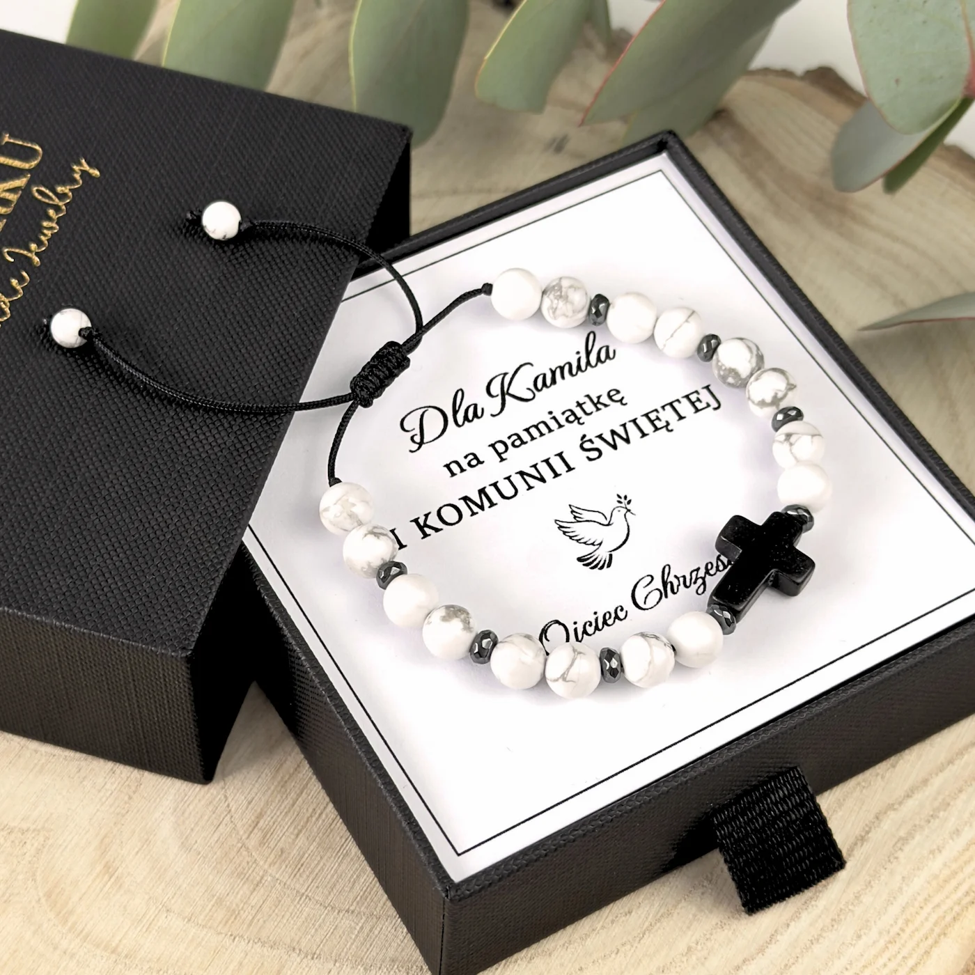 PAMIĄTKA I KOMUNII ŚWIĘTEJ - Bransoletka dla chłopca z Howlitu z czarnym krzyżem