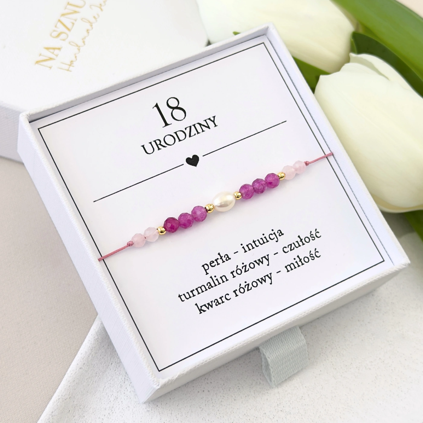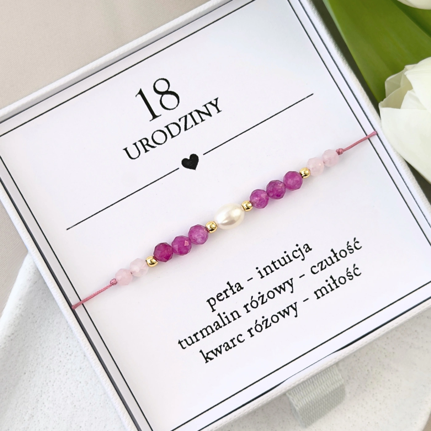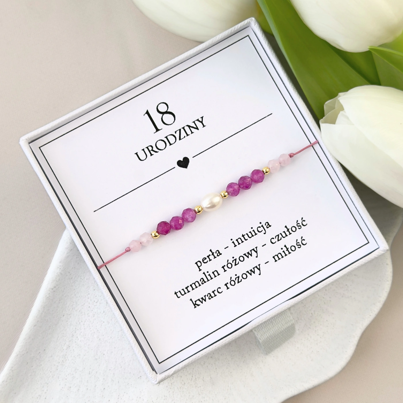 Delikatna bransoletka na osiemnaste urodziny z naturalną Perłą, Turmalinem Różowym i Kwarcem Różowym to elegancki prezent dla młodej kobiety wkraczającej w dorosłość. Złote przekładki z Hematytu dodają całości subtelnego blasku. Wykonana jest na różowym sznurku z regulowanym wiązaniem makramy, dzięki czemu dopasowuje się do rozmiaru nadgarstka.