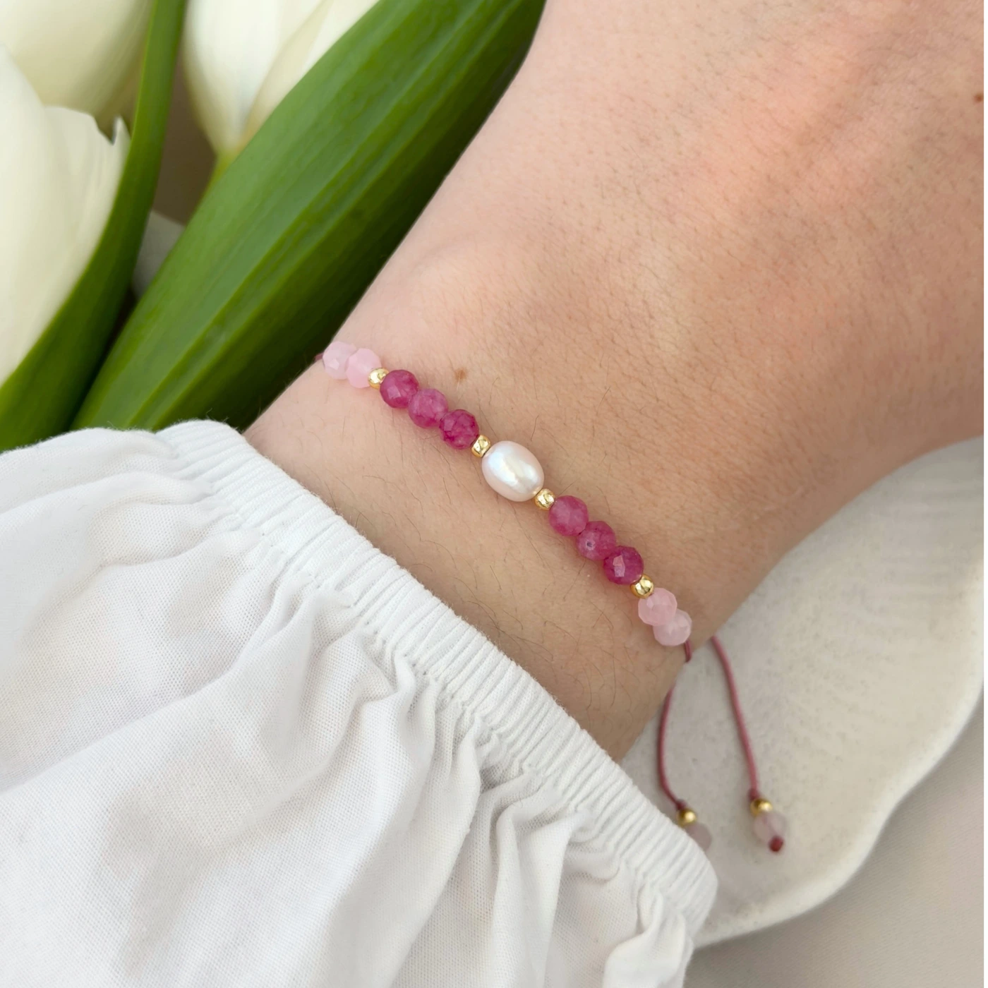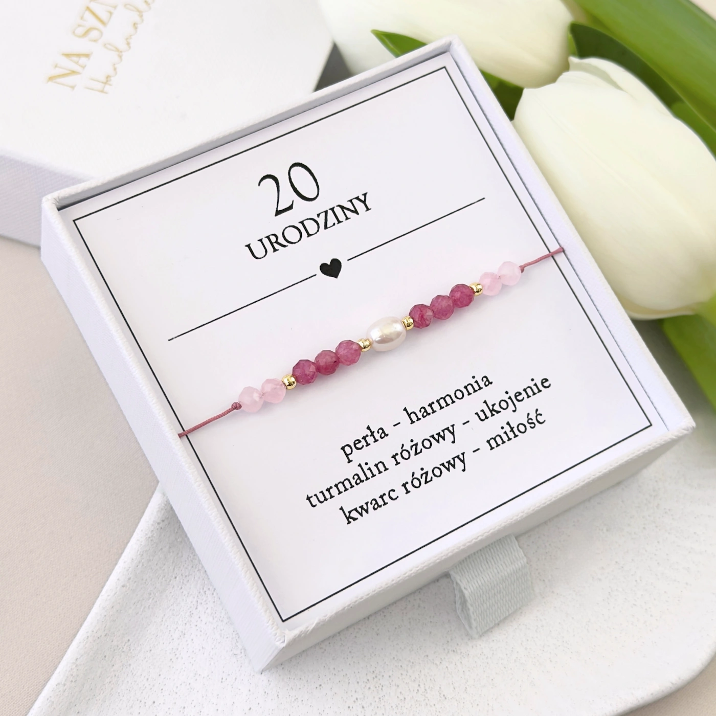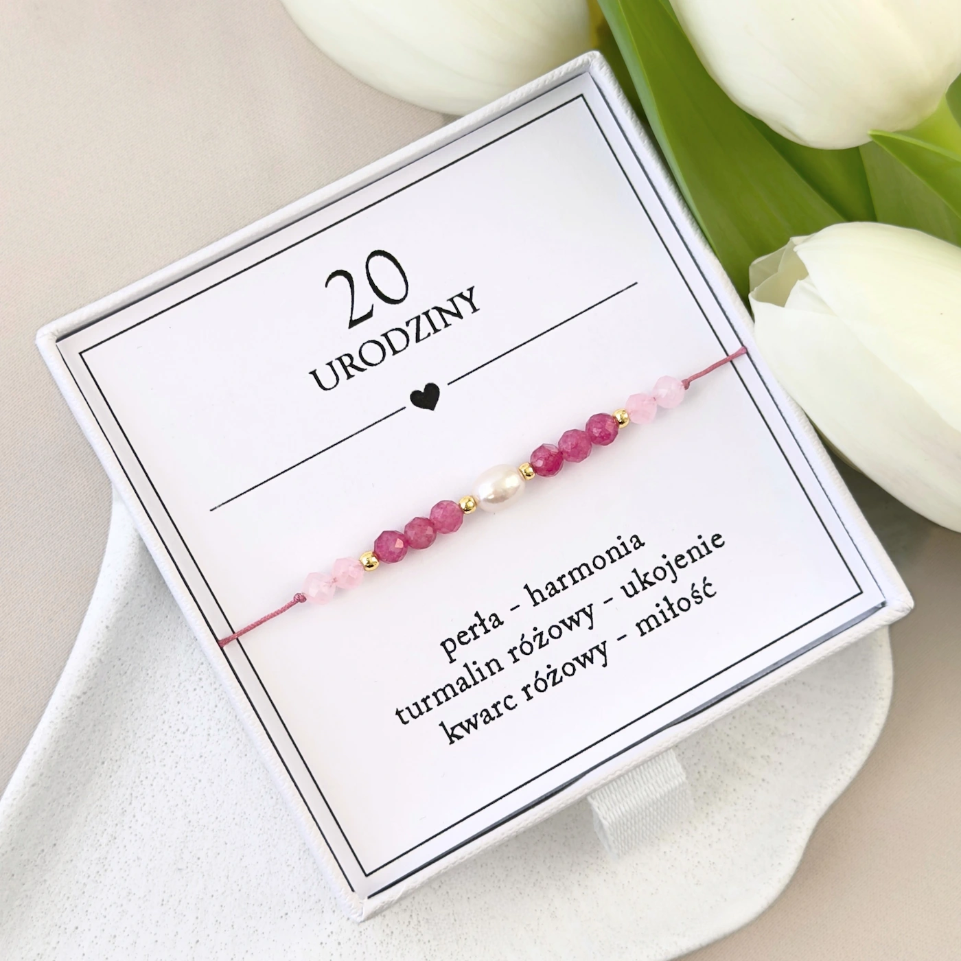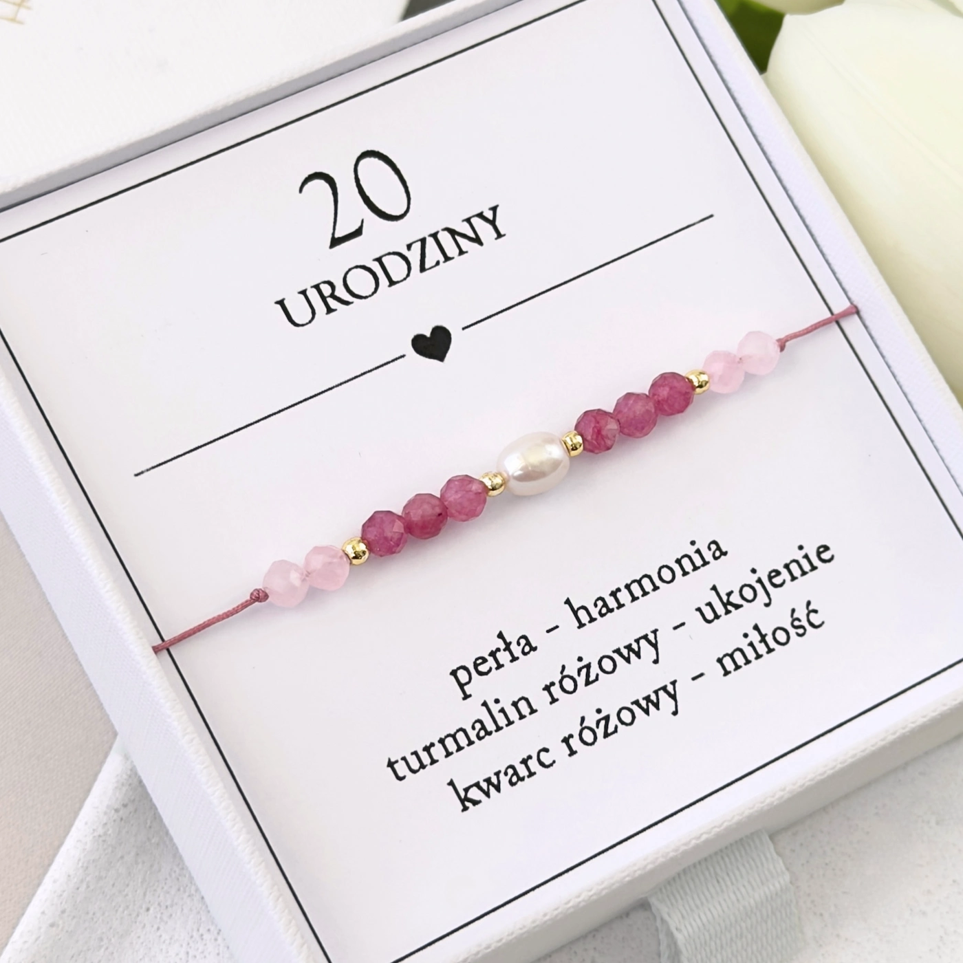 Delikatna bransoletka na dwudzieste urodziny z naturalną Perłą, Turmalinem Różowym i Kwarcem Różowym to elegancki i kobiecy dodatek. Złote przekładki z Hematytu dodają całości subtelnego blasku. Wykonana jest na różowym sznurku z regulowanym wiązaniem makramy, dzięki czemu dopasowuje się do rozmiaru nadgarstka.