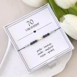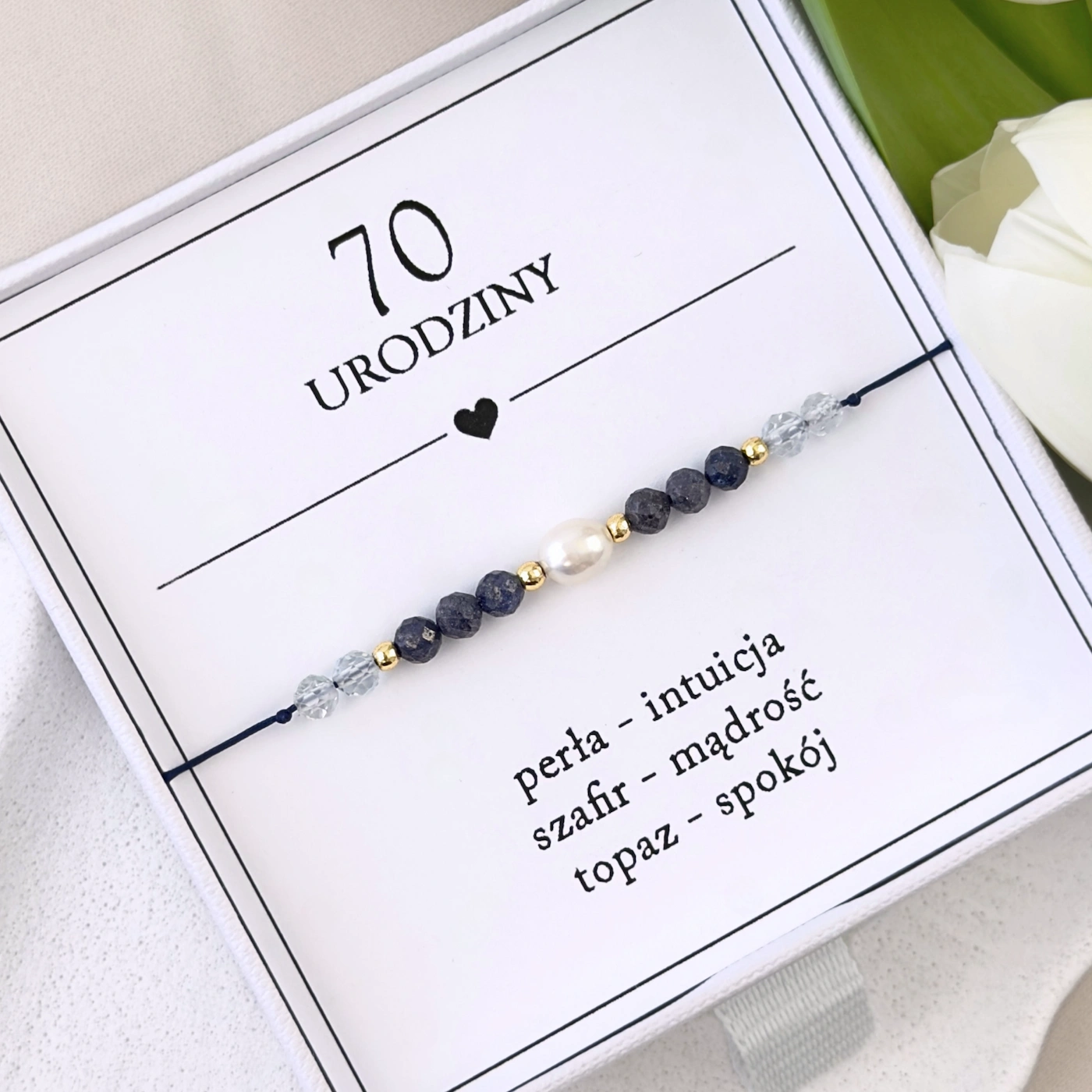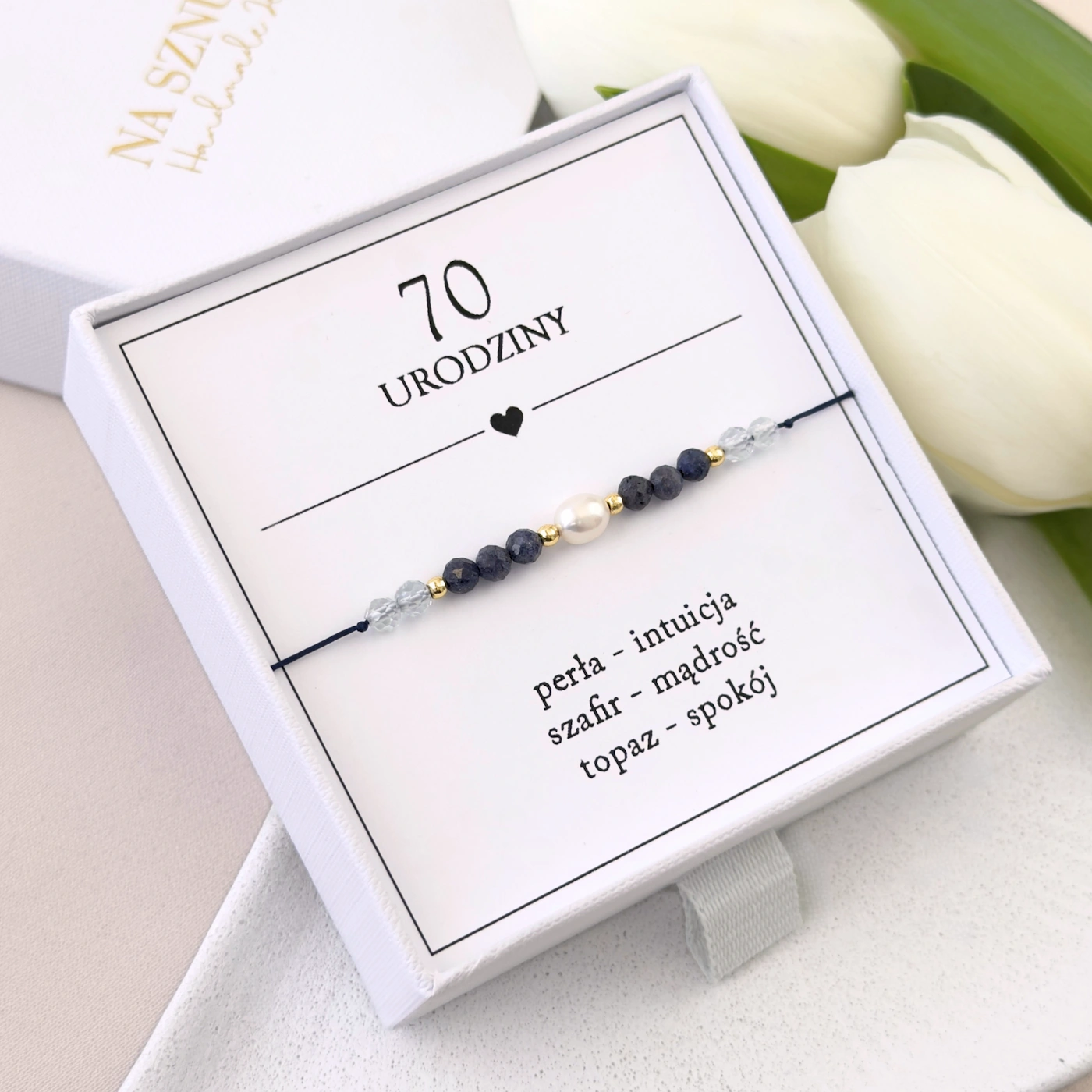 Bransoletka na 70 urodziny z naturalną Perłą, Szafirem i Topazem to subtelna kompozycja o szlachetnym charakterze. Złote kulki z pozłacanego Hematytu dodają blasku. Wykonana na granatowym sznurku z regulowanym wiązaniem makramy, dzięki czemu dopasowuje się do rozmiaru nadgarstka.